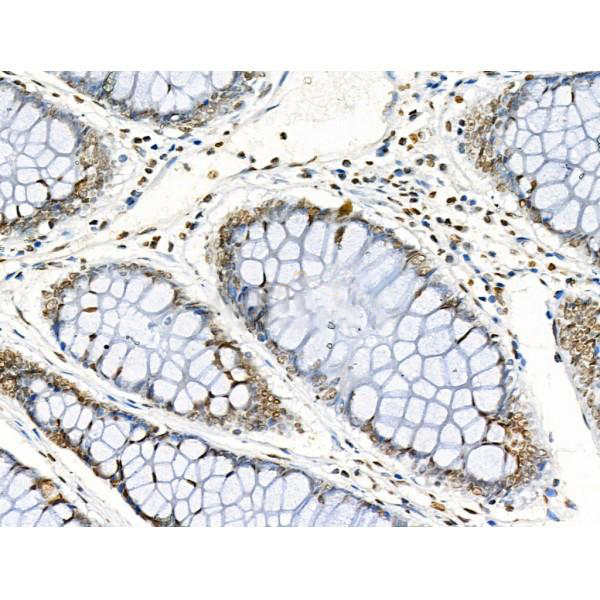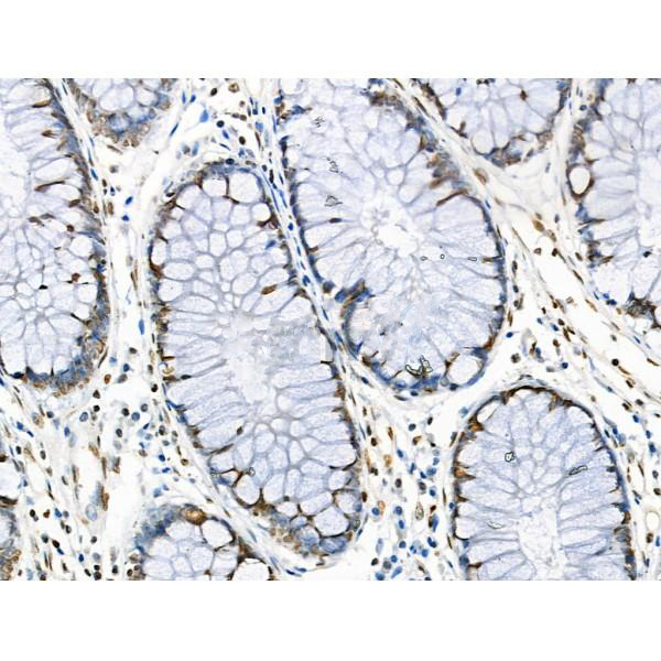 ab10665 at 1/100 staining Human colorectal cancer by IHC-P. The sample was formaldehyde fixed and a heat mediated antigen retrieval step in citrate buffer was performed. The sample was then blocked and incubated with the primary antibody at 4°C overnight. An HRP conjugated anti-Rabbit antibody was used as the secondary antibody....