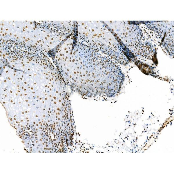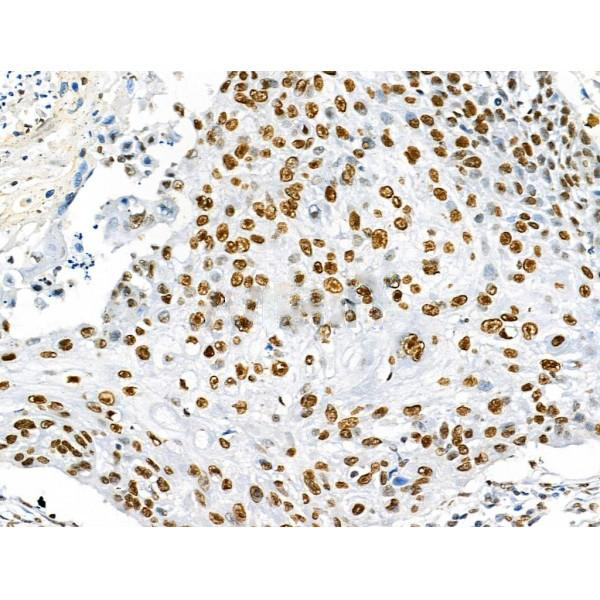 ab10665 at 1/100 staining Human esophageal cancer by IHC-P. The sample was formaldehyde fixed and a heat mediated antigen retrieval step in citrate buffer was performed. The sample was then blocked and incubated with the primary antibody at 4°C overnight. An HRP conjugated anti-Rabbit antibody was used as the secondary antibody....