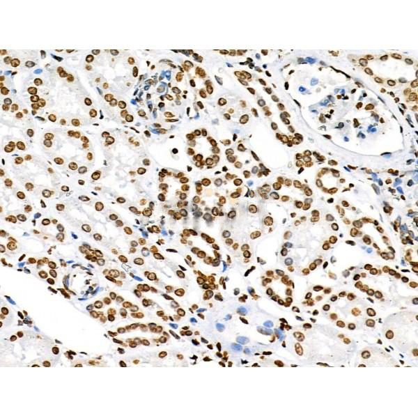 ab10665 at 1/100 staining Human kidney cancer by IHC-P. The sample was formaldehyde fixed and a heat mediated antigen retrieval step in citrate buffer was performed. The sample was then blocked and incubated with the primary antibody at 4°C overnight. An HRP conjugated anti-Rabbit antibody was used as the secondary antibody....