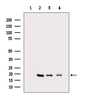 Western blot analysis of extracts from various samples, using Acetyl-Histone H3 (Lys9/14/18/23/27) Antibody. Lane 1: Heat-shock treated EC304 cells, blocked with antigen-specific peptides, Lane 2: Heat-shock treated EC304 cells, Lane 3: UV treated A2780 cells, Lane 4: UV treated RAW264.7 cells....