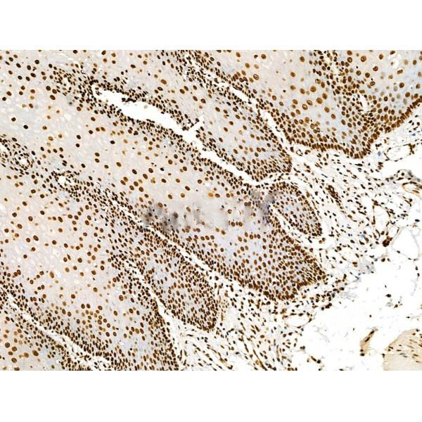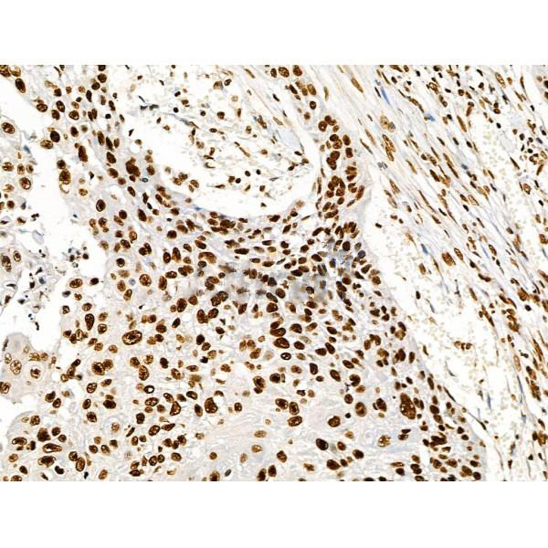 ab10676 at 1/100 staining Human esophageal cancer by IHC-P. The sample was formaldehyde fixed and a heat mediated antigen retrieval step in citrate buffer was performed. The sample was then blocked and incubated with the primary antibody at 4°C overnight. An HRP conjugated anti-Rabbit antibody was used as the secondary antibody....