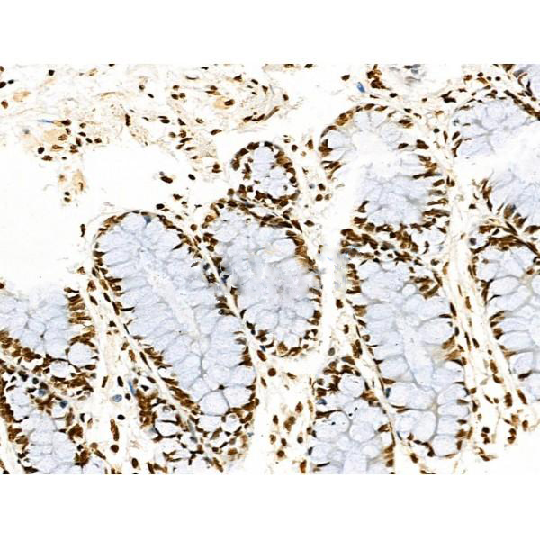 ab10676 at 1/100 staining Human colorectal cancer by IHC-P. The sample was formaldehyde fixed and a heat mediated antigen retrieval step in citrate buffer was performed. The sample was then blocked and incubated with the primary antibody at 4°C overnight. An HRP conjugated anti-Rabbit antibody was used as the secondary antibody....
