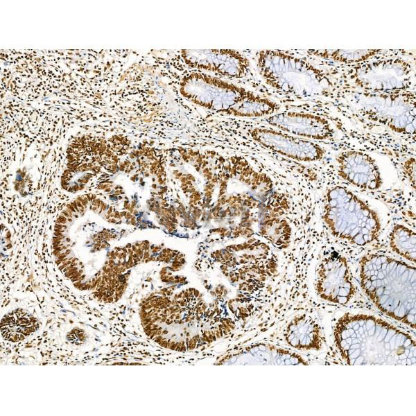 ab10676 at 1/100 staining Human colorectal cancer and adjacent normal tissues by IHC-P. The sample was formaldehyde fixed and a heat mediated antigen retrieval step in citrate buffer was performed. The sample was then blocked and incubated with the primary antibody at 4°C overnight. An HRP conjugated anti-Rabbit antibody was used as the secondary antibody....
