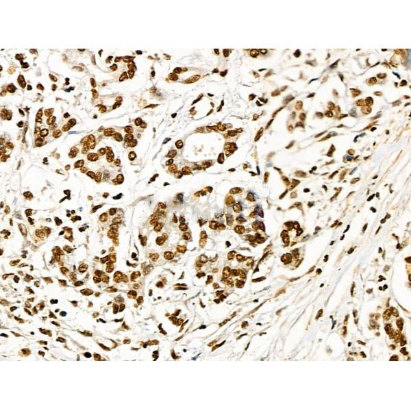 ab10676 at 1/100 staining Human pancreatic cancer by IHC-P. The sample was formaldehyde fixed and a heat mediated antigen retrieval step in citrate buffer was performed. The sample was then blocked and incubated with the primary antibody at 4°C overnight. An HRP conjugated anti-Rabbit antibody was used as the secondary antibody....