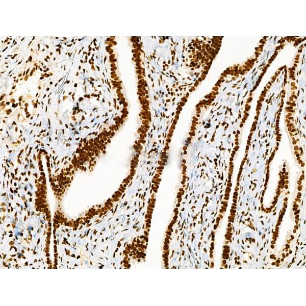 ab10676 at 1/100 staining Human ovarian cancer by IHC-P. The sample was formaldehyde fixed and a heat mediated antigen retrieval step in citrate buffer was performed. The sample was then blocked and incubated with the primary antibody at 4°C overnight. An HRP conjugated anti-Rabbit antibody was used as the secondary antibody....