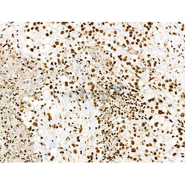 ab10676 at 1/100 staining Human kidney cancer by IHC-P. The sample was formaldehyde fixed and a heat mediated antigen retrieval step in citrate buffer was performed. The sample was then blocked and incubated with the primary antibody at 4°C overnight. An HRP conjugated anti-Rabbit antibody was used as the secondary antibody....