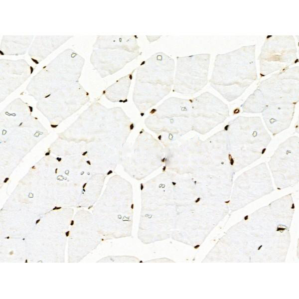ab10676 at 1/100 staining Mouse muscle tissue by IHC-P. The sample was formaldehyde fixed and a heat mediated antigen retrieval step in citrate buffer was performed. The sample was then blocked and incubated with the primary antibody at 4°C overnight. An HRP conjugated anti-Rabbit antibody was used as the secondary antibody....