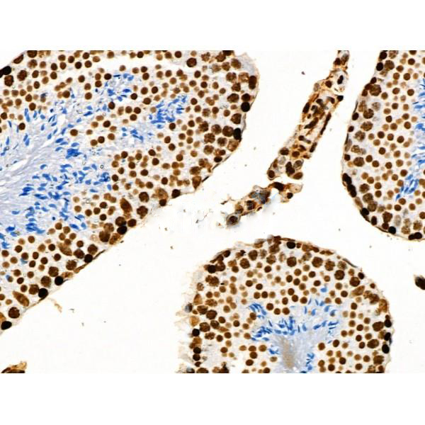 ab10676 at 1/100 staining Mouse testis tissue by IHC-P. The sample was formaldehyde fixed and a heat mediated antigen retrieval step in citrate buffer was performed. The sample was then blocked and incubated with the primary antibody at 4°C overnight. An HRP conjugated anti-Rabbit antibody was used as the secondary antibody....