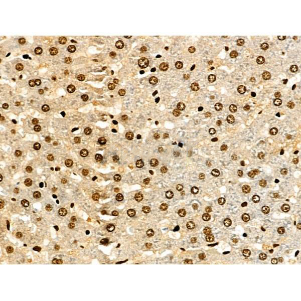 ab10676 at 1/100 staining Rat liver tissue by IHC-P. The sample was formaldehyde fixed and a heat mediated antigen retrieval step in citrate buffer was performed. The sample was then blocked and incubated with the primary antibody at 4°C overnight. An HRP conjugated anti-Rabbit antibody was used as the secondary antibody....