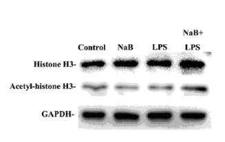 Figure 7.| Relationship between histone acetylation and the upregulation of proinflammatory cytokines, chemokines, and β-defensin transcription by sodium butyrate (NaB) during LPS stimulation. (A) Bands of the protein related to histone H3 and acetylated histone H3. Quantification of the bands from Western blots....