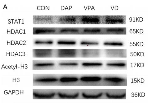 Fig. 5. |Protein expression and location of STAT1, HDACs and acetylated histone H3 in iE-DAP-stimulated BMECs after pretreatment with VPA. Western blot analysis showing the expression levels of STAT1 and HDAC1-3 (B), histone H3 and acetylated histone H3 (C) and the ratio of acetylated histone H3 to histone H3 (D)....