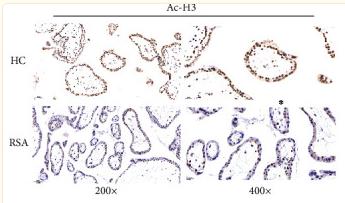 Figure 6 Downregulation of ACLY leads to change in IL-10 expression through histone acetylation. (a) The protein levels of acetylated histone H3 in villi of patients with the RSA and the HC groups, as measured using immunohistochemistry (n = 5). (b) The levels of total acetylated histone H3 and histone H3, as detected using Western blotting. (c) The expression of IL10, as detected using qRT-PCR. (d) The protein level of IL-10, as detected using ELISA. ∗∗p < 0.01, compared with the HC group; ∗∗p < 0.01, compared with shCtrl; #p < 0.05, ##p < 0.01, compared with shACLY. IOD: Integrated Optical Density. Scale bar: 200x = 50 μm, 400x = 20 μm....