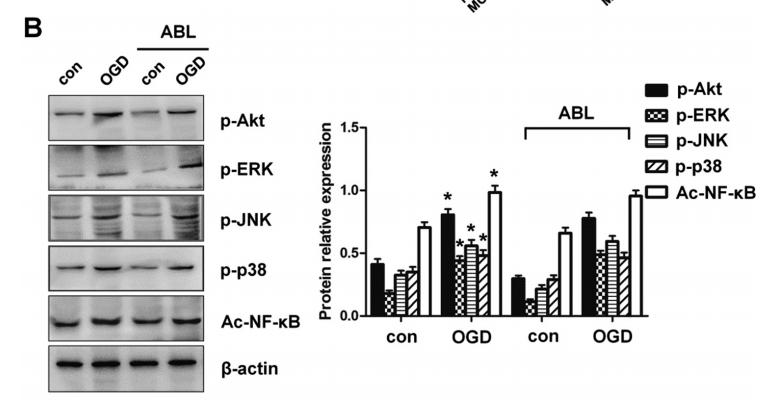 Figure 6.|ABL does not act directly on proinflammatory signaling. (A) p-Akt, p-ERK, p-JNK,p-p38, p-NF-κB and Ac-NF-κB in brain tissues of pAd-miR-155-infected mice and miR-155–/–mice treated with or without ABL (20 mg/kg) were detected by Western blotting, andband intensities that were normalized to β-actin are represented by bar graphs as themeans ± SD (n = 6 per group); *P< 0.05 versus pAd + MCAO; #P< 0.05 versus WT + MCAO.(B) BV2 cells were treated with or without ABL (100 μmol/L) for 24 h prior to OGD. p-Akt, p-ERK, p-JNK, p-p38 and Ac-NF-κB were detected by Western blotting, and band intensities that were normalized to β-actin are represented by bar graphs as the means ± SDfrom three independent experiments; *P< 0.05 versus con group....