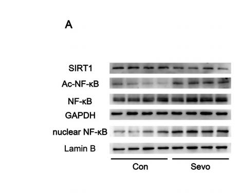 Fig. 2. Repeated sevoflurane exposure led to downregulation of SIRT1 and the upregulation of acetylated NF-κB in the hippocampi of developing mice. (A) Representative western blots of SIRT1, AC-NF-κB, total NF-κB, GAPDH, nuclear NF-κB and Lamin B proteins. (B–D) Densitometry quantification of SIRT1, AC-NF-κB/NF-κBand nuclear NF-κB. Data are shown as the means ± SEM (n = 5 per group). ∗P < .05, ∗∗P < .01....