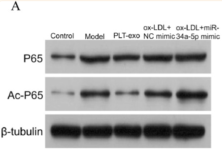 Figure 5 MiR-34a-5p aggravated HUVEC inflammation through the NF-κB signaling pathway. (A, B) The protein bands and levels of P65 and Ac-P65 were determined by WB. *P ...