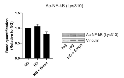 Fig. 2 Effects of empa on NF-kB and SOD2 expression and activation. A Western blot analysis for acetylated, phosphorylated and total form of NF-kB, and acetylated and total form SOD2 in AC16 cells exposed to NG concentration (4.5 mM) (NG), cells exposed to high glucose concentration (HG), and cells co-treated with HG and 0.5 nM of EMPA (HG + Empa). Densitometry analysis was performed using ImageJ 1.52n software. The histograms show the densitometric analysis of 3 separate experiments representing the relative expression being NG value set as 1. Data are mean ± SEM....