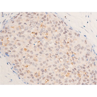 ab10588 at 1/200 staining human skin tissue sections by IHC-P. The tissue was formaldehyde fixed and a heat mediated antigen retrieval step in citrate buffer was performed. The tissue was then blocked and incubated with the antibody for 1.5 hours at 22°C. An HRP conjugated goat anti-rabbit antibody was used as the secondary antibody....