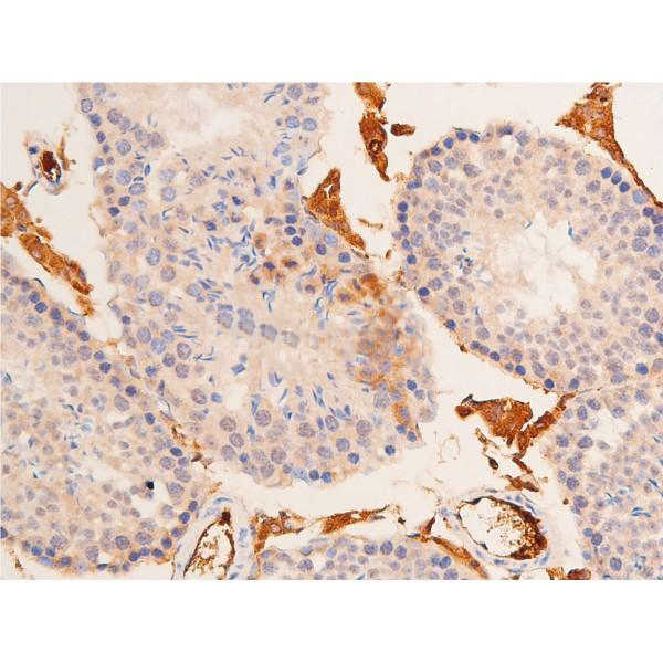 ab10588 at 1/200 staining mouse testicular tissue sections by IHC-P. The tissue was formaldehyde fixed and a heat mediated antigen retrieval step in citrate buffer was performed. The tissue was then blocked and incubated with the antibody for 1.5 hours at 22°C. An HRP conjugated goat anti-rabbit antibody was used as the secondary antibody....