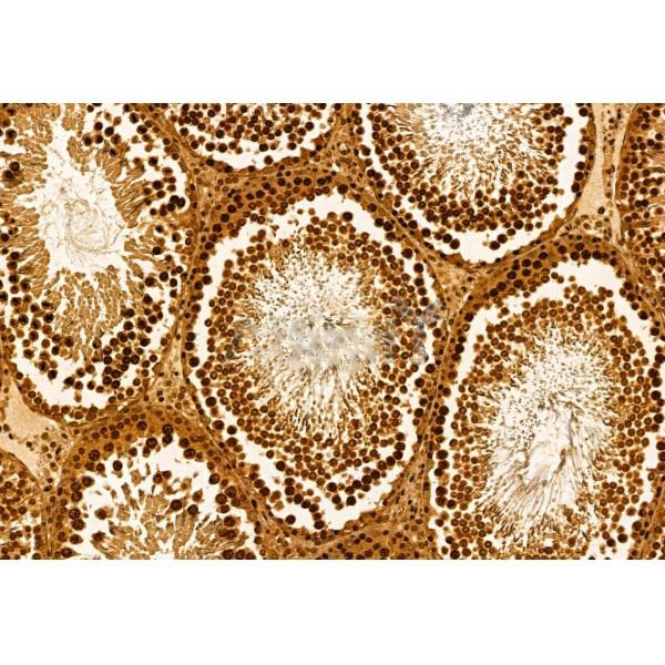 ab12667 at 1/100 staining Mouse testis tissue by IHC-P. The sample was formaldehyde fixed and a heat mediated antigen retrieval step in citrate buffer was performed. The sample was then blocked and incubated with the primary antibody at 4°C overnight. An HRP conjugated anti-Rabbit antibody was used as the secondary antibody....