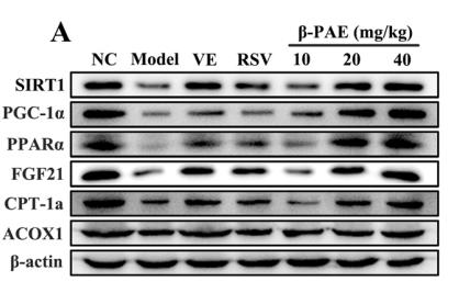 Fig. 6. β-PAE promotes the expression of hepatic lipid oxidation-related proteins and genes in HFD-fed rats. (A–G) Western blot analysis on the expression of SIRT1, PGC-1α, PPARα, FGF21, CPT-1a and ACOX1; (H–K) The mRNA expression of SIRT1, PPARα, CPT-1a and ACOX1. Data are presented as the mean ± SD (n = 6~8). ##p < 0.01 vs. NC group; *p < 0.05, **p < 0.01 vs. Model group....