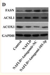 Fig. 3 Antagomir-103-3p alleviated the damage to mice with NAFLD. Mice with NAFLD were fed an HFD for 8 weeks, and Antagomir-NC or Antagomir-103-3p was used for tail vein injection once a week for 2 weeks. A MiR-103-3p expression in mouse liver tissues was examined by qRT-PCR. B Oil Red O staining detected lipid droplet accumulation in mouse liver tissues, and HE staining detected liver tissue lesions in mice. C The TG, ALT, AST and H2O2 contents in mouse serum were examined, while ROS generation and ATP content were examined in mouse tissues. D The protein and mRNA levels of ACOX1, FASN and ACSL1 were examined by western blotting and qRT-PCR, respectively. *P < 0.05 compared with the control group; #P < 0.05 compared with the NAFLD+Antagomir-NC group...