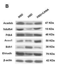 FIGURE 6 Effect of CANA on the cardiac protein expression. (A) Heat map of individual genes within selected pathways, colored by the log2fold change; (B) Selected genes (Acadsb, Ndufb4, Pdk4, Acox1, Bdh1, and Ehhadh) were validated by Western blotting; (C,D) Quantitative evaluation of the protein expression of selected genes (Acadsb, Ndufb4, Pdk4, Acox1, Bdh1, and Ehhadh). * p < 0.05, ** p < 0.01 vs. NSD. # p < 0.05 vs. HSD....