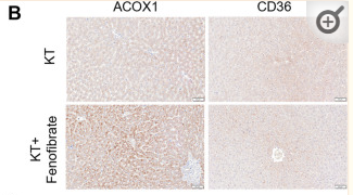 Fig. 2 Fenofibrate treatment attenuated fibrosis in a rat model of renal transplantation. A Schematic view of the treatment of fenofibrate in a rat model of renal transplantation. B Gross morphology of bilateral kidneys from rat underwent kidney transplantation (KT). C IF detected the expression of ACOX1 and α-SMA in transplanted kidney of rats, cell nuclei were strained in blue, renal tubular epithelial cells were stained green, ACOX1 was stained violet, and α-SMA was stained red. Scale bar: 50 μm. D HE, Masson, and Sirius Red staining in transplanted kidney from rat models with or without fenofibrate treatment. Scale bar: 50 μm. E Relative fibrosis level compared fenofibrate treatment group with control group. Significance was determined by Student’s t test....