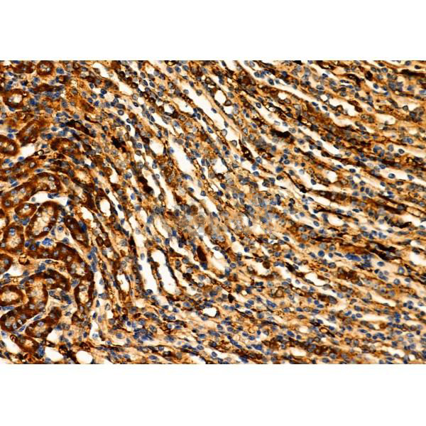 ab16762 at 1/100 staining Mouse kidney tissue by IHC-P. The sample was formaldehyde fixed and a heat mediated antigen retrieval step in citrate buffer was performed. The sample was then blocked and incubated with the primary antibody at 4°C overnight. An HRP conjugated anti-Rabbit antibody was used as the secondary antibody....