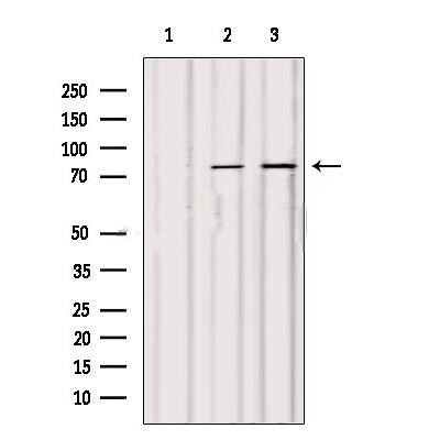 Western blot analysis of extracts from various samples, using ACSL4/FACL4 Antibody. Lane 1: 3t3 treated with blocking peptide; Lane 2: 3t3; Lane 3: Mouse spleen....