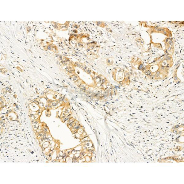 ab12762 at 1/100 staining Human pancreatic cancer by IHC-P. The sample was formaldehyde fixed and a heat mediated antigen retrieval step in citrate buffer was performed. The sample was then blocked and incubated with the primary antibody at 4°C overnight. An HRP conjugated anti-Rabbit antibody was used as the secondary antibody....