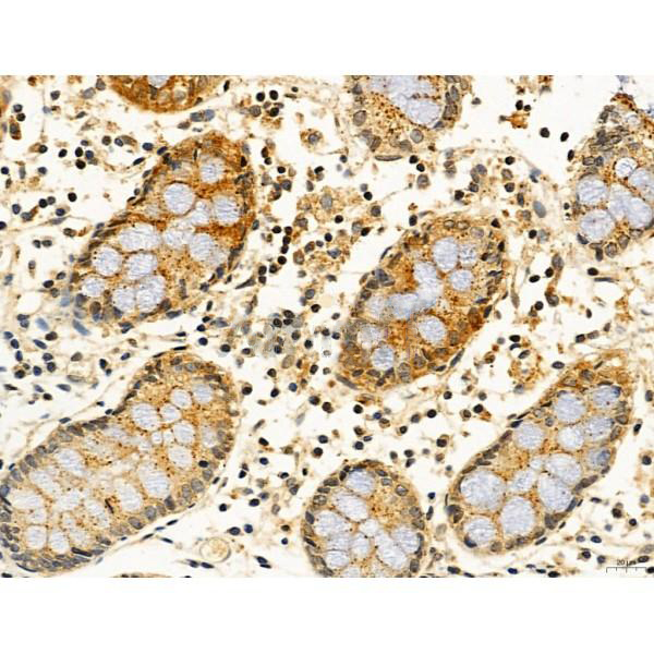 ab12762 at 1/100 staining Human normal tissues adjacent to colorectal cancer by IHC-P. The sample was formaldehyde fixed and a heat mediated antigen retrieval step in citrate buffer was performed. The sample was then blocked and incubated with the primary antibody at 4°C overnight. An HRP conjugated anti-Rabbit antibody was used as the secondary antibody....