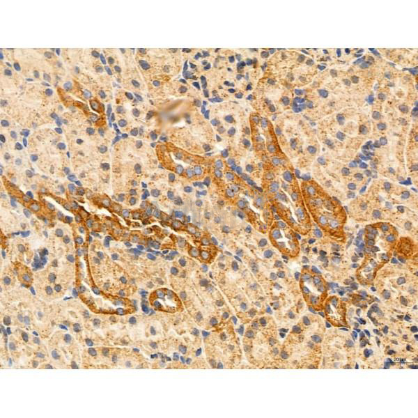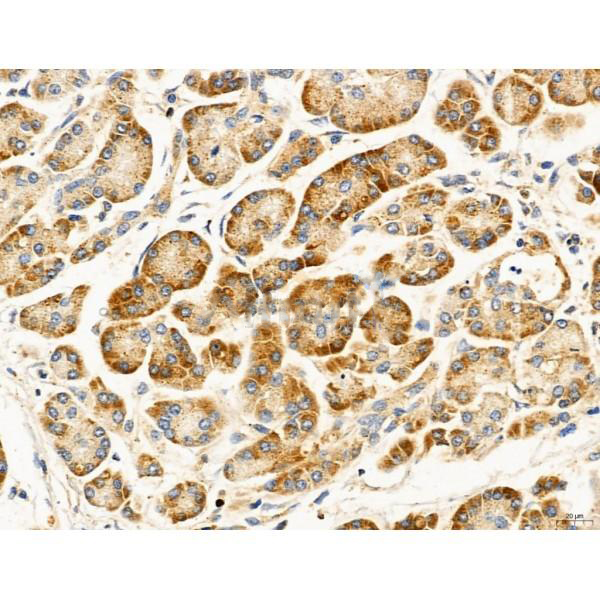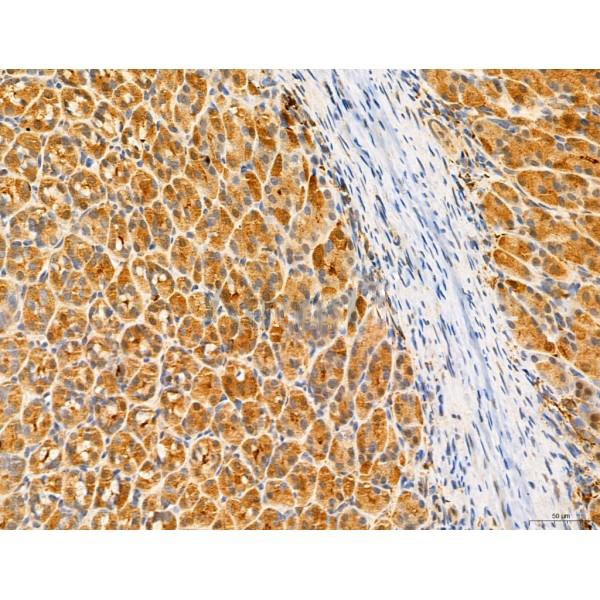 ab12762 at 1/100 staining Rat stomach tissue by IHC-P. The sample was formaldehyde fixed and a heat mediated antigen retrieval step in citrate buffer was performed. The sample was then blocked and incubated with the primary antibody at 4°C overnight. An HRP conjugated anti-Rabbit antibody was used as the secondary antibody....