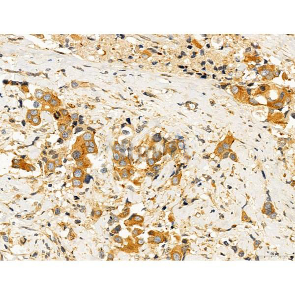 ab12762 at 1/100 staining Human mammary cancer by IHC-P. The sample was formaldehyde fixed and a heat mediated antigen retrieval step in citrate buffer was performed. The sample was then blocked and incubated with the primary antibody at 4°C overnight. An HRP conjugated anti-Rabbit antibody was used as the secondary antibody....