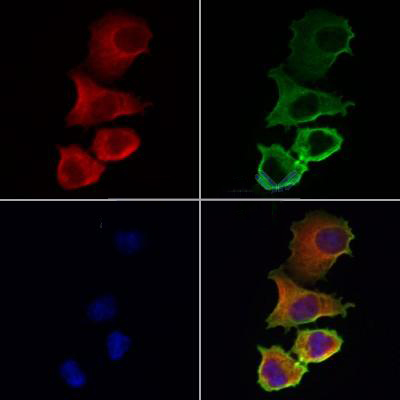ab12762 staining Hela cells by IF/ICC. The samples were fixed with PFA and permeabilized in 0.1% Triton X-100,then blocked in 10% serum for 45 minutes at 25°C. Samples were then incubated with primary Ab(ab12762 1:200) and mouse anti-beta tubulin Ab(T0023 1:200) for 1 hour at 37°C. An AlexaFluor594 conjugated goat anti-rabbit IgG(H+L) Ab(Red) and an AlexaFluor488 conjugated goat anti-mouse IgG(H+L) Ab(Green) were used as the secondary antibody. The nuclear counter stain is DAPI(blue)....