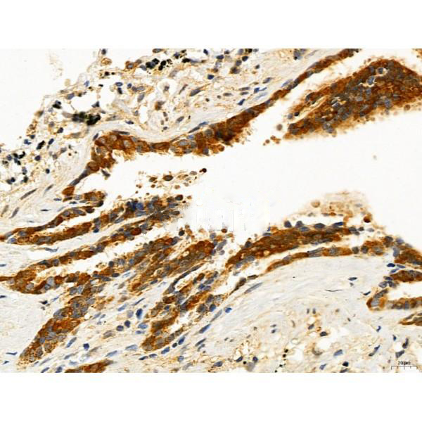 ab12762 at 1/100 staining Human normal tissues adjacent to lung cancer by IHC-P. The sample was formaldehyde fixed and a heat mediated antigen retrieval step in citrate buffer was performed. The sample was then blocked and incubated with the primary antibody at 4°C overnight. An HRP conjugated anti-Rabbit antibody was used as the secondary antibody....