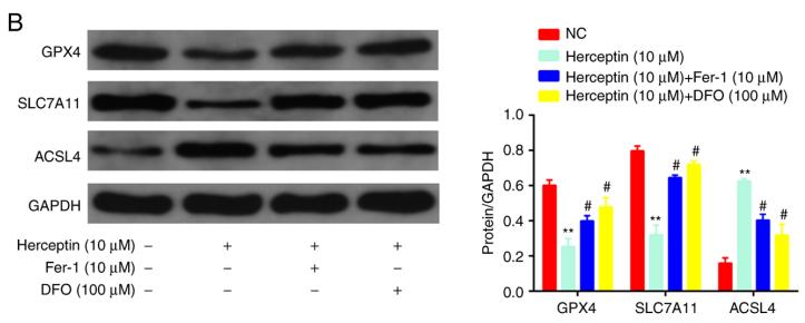 Figure 3. | Fer‑1 protects H9c2 cells against Herceptin‑induced cell injury and ferroptosis. Fer‑1 and DFO reversed the (A) Herceptin‑induced reduction in cell viability, (B) Herceptin‑induced decrease in GPX4 and SLC7A11 protein expression and Herceptin‑induced increase in ACSL4 protein expression....