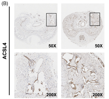 FIGURE 5 The expression level of GPX4, ACSL4, and SLC7A11: (A) representative results of immunohistochemistry (IHC) and relative expression of GPX4; (B) representative results of IHC and relative expression of ACSL4; and (C) representative results of IHC and relative expression of SLC7A11. *p < 0.05 compared with the control group...