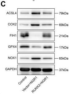 Figure 6 NGR1 induces ferroptosis in breast cancer cells by down-regulating RUNX2. (A) Changes in the concentration of MDA and Fe2+ in MDA-MB-23 and SK-BR-3 cells were detected after NGR1 treatment. (B, C) Changes in the expression of ACSL4, COX2, FIH1, GPX4, and NOX1 proteins were detected by Western blot in MDA-MB-231 and SK-BR-3 cells. (* P < 0.05, ** P < 0.01, *** P < 0.001, **** P < 0.0001)....