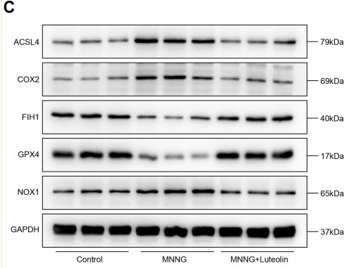 Figure 5 Luteolin inhibits ferroptosis in rat gastric tissue. (A) Changes in the levels of Fe2+ and MDA in gastric tissues of luteolin-treated rats. (B) Changes in the mRNA expression of FIH1, COX2, ACSL4, GPX4, and NOX1 were detected using qPCR. (C) Western blot analysis of the protein expression levels of FIH1, COX2, ACSL4, GPX4, and NOX1....