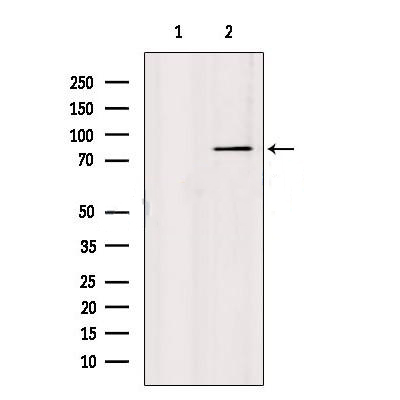 Western blot analysis of extracts from Colo205, using ACVR2A Antibody. The lane on the left was treated with blocking peptide. Observed bands: 80 kDa....