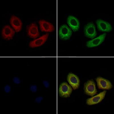 ab16790 staining Hela cells by IF/ICC. The samples were fixed with PFA and permeabilized in 0.1% Triton X-100,then blocked in 10% serum for 45 minutes at 25°C. Samples were then incubated with primary Ab(ab16790 1:200) and mouse anti-beta tubulin Ab(T0023 1:200) for 1 hour at 37°C. An AlexaFluor594 conjugated goat anti-rabbit IgG(H+L) Ab(Red) and an AlexaFluor488 conjugated goat anti-mouse IgG(H+L) Ab(Green) were used as the secondary antibody. The nuclear counter stain is DAPI(blue)....