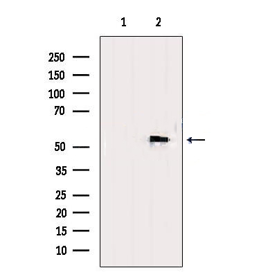 Western blot analysis of extracts from Hela, using ADAM10 Antibody. The lane on the left was treated with blocking peptide. Observed bands: 55 kDa....