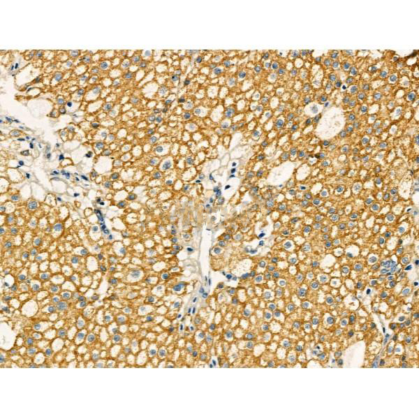 ab11086 at 1/100 staining Human kidney cancer by IHC-P. The sample was formaldehyde fixed and a heat mediated antigen retrieval step in citrate buffer was performed. The sample was then blocked and incubated with the primary antibody at 4°C overnight. An HRP conjugated anti-Rabbit antibody was used as the secondary antibody....