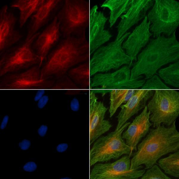 ab14598 staining A549 cells by IF/ICC. The samples were fixed with PFA and permeabilized in 0.1% Triton X-100,then blocked in 10% serum for 45 minutes at 25°C. Samples were then incubated with primary Ab(ab14598) and mouse anti-beta tubulin Ab(T0023) for 1 hour at 37°C. An AlexaFluor594 conjugated goat anti-rabbit IgG(H+L) Ab(Red) and an AlexaFluor488 conjugated goat anti-mouse IgG(H+L) Ab(Green) were used as the secondary antibody. The nuclear counter stain is DAPI (blue)....