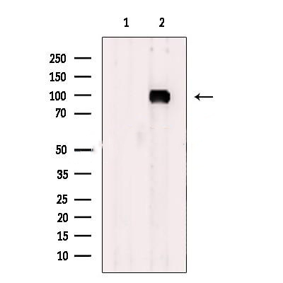 Western blot analysis of extracts from 293 cells, using ADAM32 Antibody. The lane on the left was treated with blocking peptide....