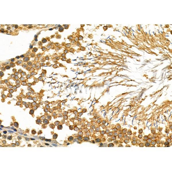 ab17052 at 1/100 staining Mouse testis tissue by IHC-P. The sample was formaldehyde fixed and a heat mediated antigen retrieval step in citrate buffer was performed. The sample was then blocked and incubated with the primary antibody at 4°C overnight. An HRP conjugated anti-Rabbit antibody was used as the secondary antibody....