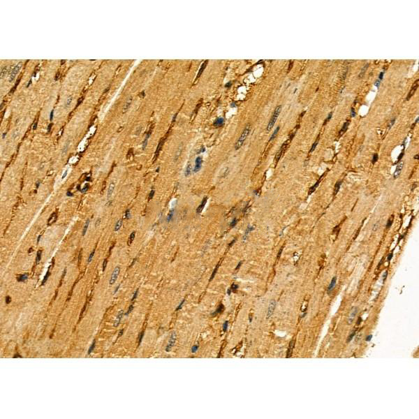 ab17052 at 1/100 staining Rat heart tissue by IHC-P. The sample was formaldehyde fixed and a heat mediated antigen retrieval step in citrate buffer was performed. The sample was then blocked and incubated with the primary antibody at 4°C overnight. An HRP conjugated anti-Rabbit antibody was used as the secondary antibody....