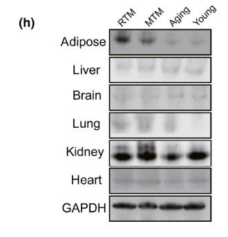 FIGURE 1|Rat‐to‐mouse (RTM) xenotransplanted brown adipose tissue (BAT) was functional well and did not cause injurious histocompatibility in aging mice.(h) HLA‐A blot showed that HLA‐A level in BAT of RTM and MTM groups was significantly higher than aging or young group; HLA‐A level in the lung of young group is significantly low; HLA‐A levels in other main tissues (liver,spleen, brain, kidney, heart) are similar among all four groups...