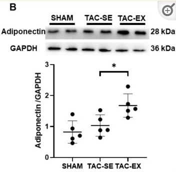 Figure 5 Effects of exercise on the expressions of β3-AR and adiponectin in PVAT of mice after TAC. Representative Western blot assessment of β3-AR (A) and adiponectin (B) expressions in PVAT normalized to the expressions of GAPDH. Data were analyzed using one-way ANOVA; values are mean ± SD. * indicates p < 0.05. Abbreviations: β3-AR, β3-adrenergic receptor; SHAM, sham surgery; TAC-SE, transverse aortic constriction-sedentary; and TAC-EX, transverse aortic constriction-exercise....