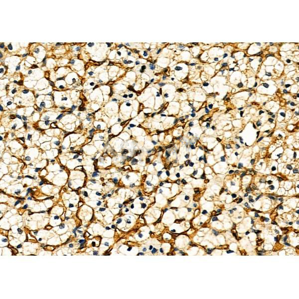 ab17052 at 1/100 staining Human kidney cancer by IHC-P. The sample was formaldehyde fixed and a heat mediated antigen retrieval step in citrate buffer was performed. The sample was then blocked and incubated with the primary antibody at 4°C overnight. An HRP conjugated anti-Rabbit antibody was used as the secondary antibody....